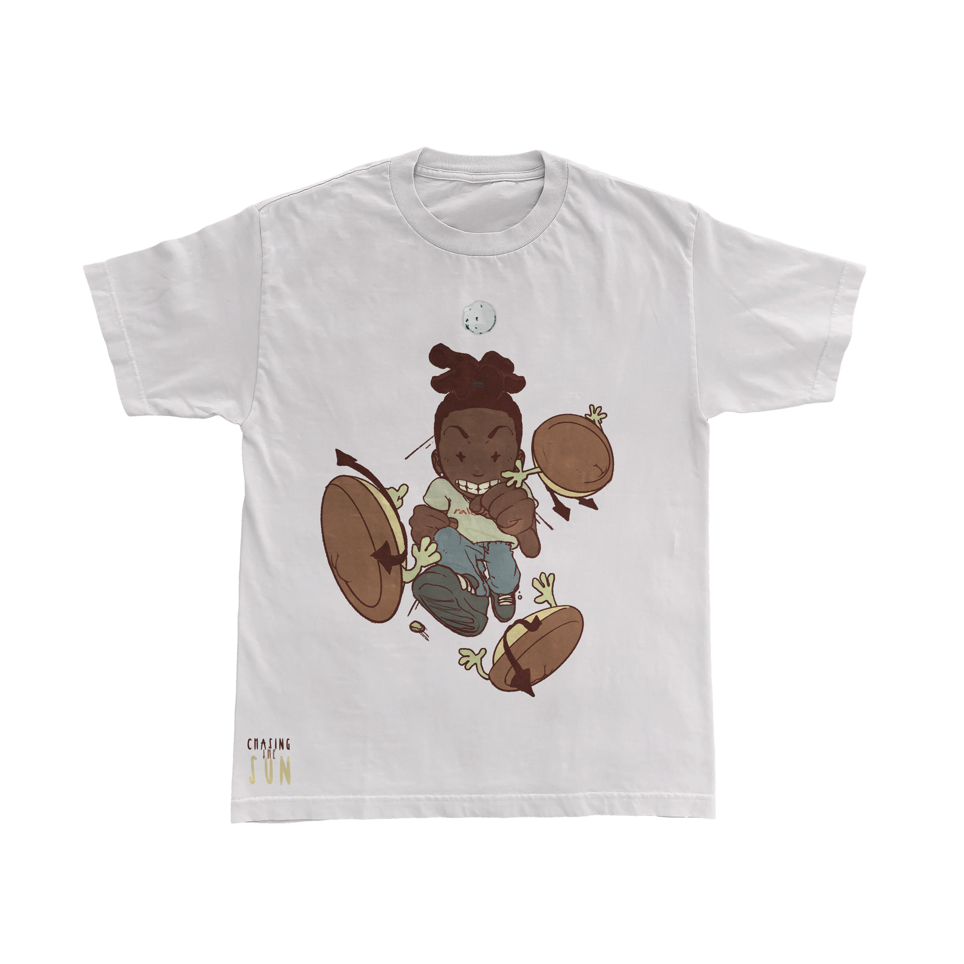 Raleighwood x LesTheGenius "Find Your Chase" White Tee-Shirt. Printed "Lap Around The Sun" Pack front and back mixtape covers.